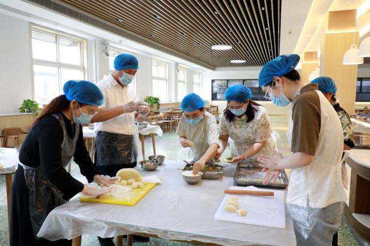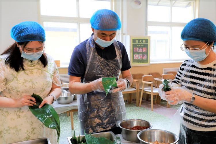 學(xué)校提前準(zhǔn)備好粽葉、糯米、大棗、紅豆、面團(tuán)、韭菜餡料等食材,老師們陸續(xù)來到餐廳,舞動(dòng)?jì)故斓那墒?,亮出自己?ldquo;絕活”,拿粽葉、舀糯米、放配料,包裹粽葉,用繩捆綁,把對(duì)生活的熱愛包進(jìn)甜甜的粽子里。包菜角的老師們則分工合作,有的揉面、搟皮,有的填餡兒、壓實(shí)。大家圍在一起,一邊包粽子、菜角,一邊交流經(jīng)驗(yàn),現(xiàn)場(chǎng)歡聲笑語(yǔ),其樂融融。 片片粽葉,將祝福細(xì)致包裹;粒粒糯米,承載了滿滿心意。感知端午、品味端午,在中華民族傳統(tǒng)文化的滋養(yǎng)中,教職工們體會(huì)節(jié)日帶來的快樂,共同營(yíng)造溫馨和諧的校園氛圍。 |