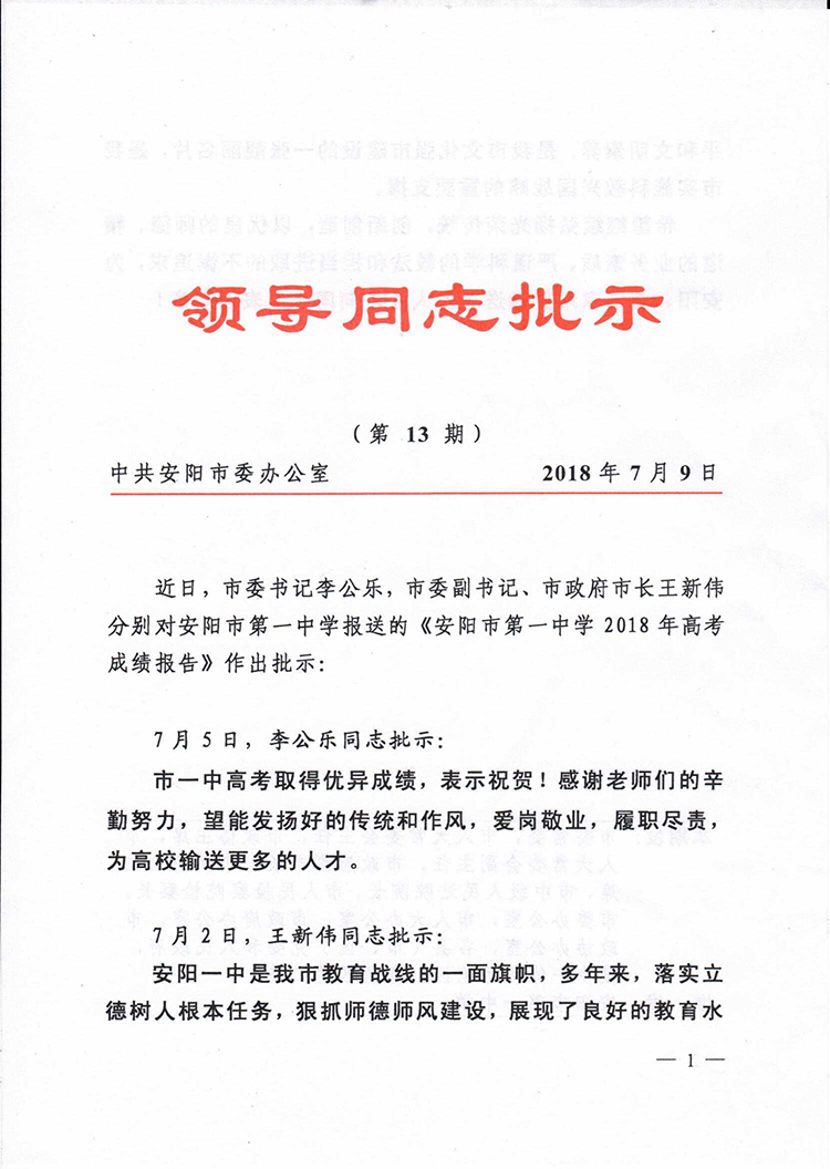 市領(lǐng)導(dǎo)對(duì)我校2018年高考成績的批示