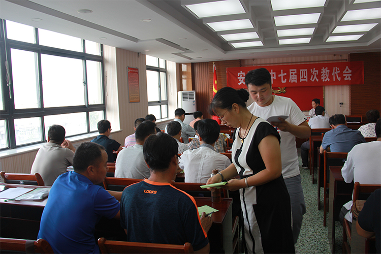 我校第七屆教職工代表大會第四次會議,7月12日下午在綜合樓613會議室隆重召開。本次會議的議題是:修改《安陽市第一中學(xué)獎勵性績效工資方案》和《安陽市第一中學(xué)教師中、高級專業(yè)技術(shù)職務(wù)任職資格推薦實施細則》(下文簡稱《方案》、《細則》)中的部分條款。會議由王國卿副校長主持,工會常務(wù)副主席、副校長陳朝陽致開幕詞,工會主席、副校長崔彥軍做了講話。會議應(yīng)到代表63人,因事、因病請假4人,實到59人,符合法定人數(shù)。 會議在莊嚴的國歌聲中開幕,陳朝陽副校長在致辭中,回顧了一年來,學(xué)校圍繞“師生友好•科學(xué)發(fā)展”開展的主要工作,指出教代會對發(fā)揮教職工的主人翁意識,促進民主、科學(xué)管理,有著重要作用。辦公室主任吳燕對《方案》、《細則》中部分條款的擬修改意見進行了說明和解釋。