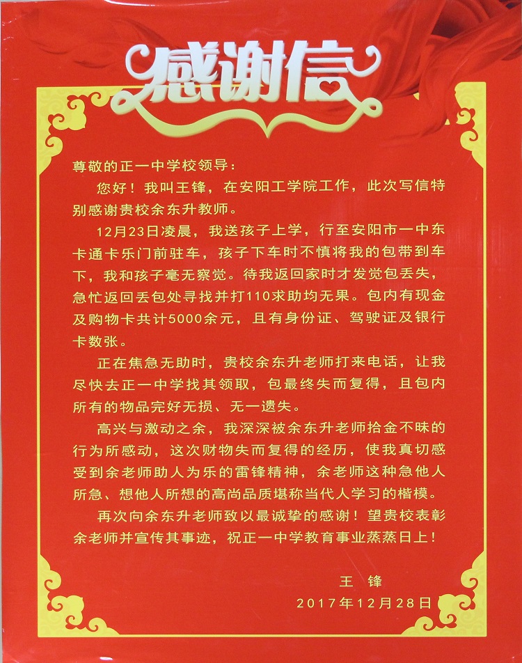 2017年12月23日早晨,余東升老師(現(xiàn)在安陽正一中學(xué)校區(qū)工作)送孩子上學(xué)途中行至卡通卡樂門店前撿到一個錢包,內(nèi)有現(xiàn)金、身份證、有價證券以及多張銀行卡等物品。為將錢包在第一時間歸還失主,余老師讓孩子自行上學(xué),原地等待失主十?dāng)?shù)分鐘。在沒有等到失主的情況下,他才匆匆趕去上班。當(dāng)天課后,余老師先后撥打114、12580,終于與失主取得聯(lián)系,將錢包完璧歸趙。失主要重謝余老師,被余老師婉拒。2018年1月8日上午,失主王鋒將感謝信送到我校,學(xué)校才了解了事情的經(jīng)過。
