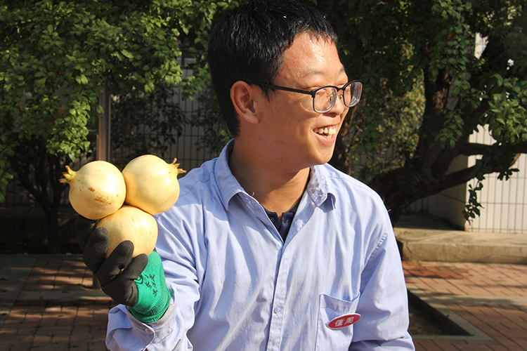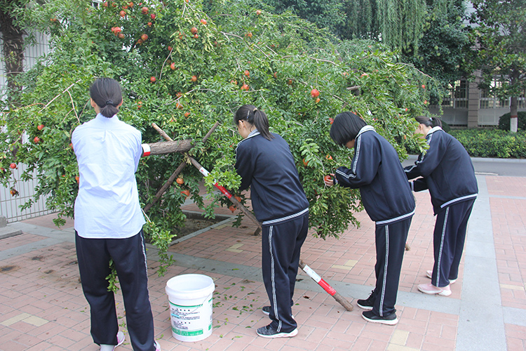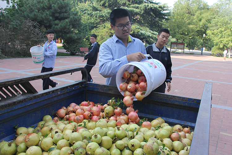 又是豐收的一年。教學樓前的石榴樹已被滿樹的碩果壓彎了腰,桂花的香氣彌漫了秋日的校園。 到了一年一度摘石榴的日子,9月25日清晨,值周班綠化組的同學們在老師的帶領(lǐng)下對校園內(nèi)的石榴進行采摘。同學們分工合作,有的采摘低處的果實,有的踩著梯子夠高處的,沒多久就把樹上的石榴全部采摘了下來。之后,學??倓仗帉⑹衿骄值搅嗣總€班和老師的辦公室,讓師生一起品嘗這份甘甜。 我們似乎已經(jīng)習慣了果實掛滿枝頭的校園一景。石榴、杏兒、桃子……隨手可得的果實卻在一中的校園里被保護到成熟,雖屬平常小事,卻是全體師生文明素養(yǎng)的體現(xiàn)。‘’