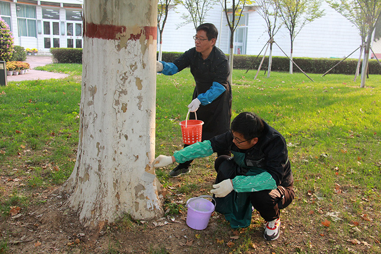 美麗的校園離不開對學(xué)校里植物的精心呵護(hù)。隨著氣溫越來越低,樹木也急需殺菌、防蟲、防凍害。10月18日下午,我校組織教職工為校園內(nèi)越冬樹木刷白養(yǎng)護(hù)。 總務(wù)處提前準(zhǔn)備好了工具和刷白劑,規(guī)劃好勞動(dòng)區(qū)域,并安排了專業(yè)的勞動(dòng)指導(dǎo)員為大家此次養(yǎng)護(hù)工作進(jìn)行培訓(xùn)和指導(dǎo)。老師們穿上全套“工作服”,揮舞著小刷子,將涂料仔仔細(xì)細(xì)地刷滿指定高度。一下午的勞動(dòng)之后,校園里的樹木就全部穿上白色的小靴子。 冬季的害蟲冬眠在土壤里,棲息在樹干中,給樹木刷上石灰水就能防止蟲子破壞樹木,還能防凍害和日灼,保護(hù)樹木的正常生長。 校園里參天的大樹見證一中的變化,這些大樹也是在一代代安陽一中人的愛護(hù)下不斷成長的。每學(xué)期,我校都組織教職工進(jìn)行建校勞動(dòng),讓大家通過勞動(dòng)建校,美化校園、愛校,珍惜校園內(nèi)的一草一木。