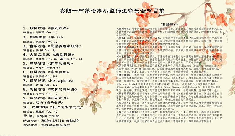 我校于2019年1月11日在電教樓五樓報告廳舉辦了新年師生音樂會。 由11位學生及教師組成的演員團隊為大家呈現(xiàn)了一場精彩紛呈的音樂盛宴。一首竹笛演奏《春到湘江》拉開了音樂會的序幕,清脆悅耳的竹笛聲如歌如訴,娓娓道來;當經(jīng)典曲目《梁?!纺鞘煜さ男身懫?,鋼琴上柔潤與激情的碰撞,讓人久久不能平靜;《草原英雄小姐妹》、《豐收鑼鼓》的古箏表演時而溫柔平靜,時而灑脫奔放;琵琶獨奏《彝族舞曲》熱烈中隱有鼓點聲聲,將作品富有神韻地呈現(xiàn)出來;充滿畫面感的鋼琴獨奏《He's a pirate》似乎真的帶來一場狂風暴雨;陶笛獨奏《故鄉(xiāng)的原風景》空靈的笛聲悠揚婉轉(zhuǎn),讓人感覺身臨其境一樣;辛蘭芳老師和趙釗老師帶來的鋼琴獨奏《夢中的婚禮》、《彩云追月》讓大家看到了老師多才多藝的一面;最后由王藝萌同學表演的豫劇選段《秋江河下水悠悠》,讓觀眾近距離感受到了我國傳統(tǒng)戲曲文化的獨特魅力。中西音樂的交融與綻放讓音樂會高潮迭起,掌聲不斷。 我校定期舉辦的音樂會,不僅豐富了校園文化,更為師生提供了展示自我的平臺,讓大家了解音樂會,參與音樂會,享受音樂會,為校園素質(zhì)教育增添精彩的華章。