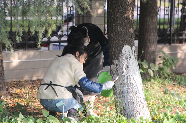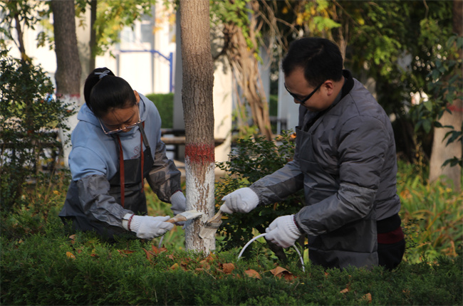 為進(jìn)一步推進(jìn)學(xué)校環(huán)境整治,確保樹木安全過(guò)冬,11月3日,我校組織教職工開展了“樹干涂白”冬季護(hù)樹建校勞動(dòng)。 綜合辦提前準(zhǔn)備好工具和刷白劑,規(guī)劃好勞動(dòng)區(qū)域,教職工們?cè)谥付ǖ攸c(diǎn)領(lǐng)取好刷樹工具后立即投入到熱火朝天的刷樹中。大家分工明確、配合默契、各就其位,對(duì)樹皮縫隙、洞孔、樹杈等處進(jìn)行重復(fù)涂刷,不忽略任何一棵樹木、一個(gè)細(xì)節(jié)。為樹木刷上石灰槳,不僅能起到防寒保暖作用,還能有效殺滅病蟲害滋生體,給樹木帶來(lái)雙重保障。在大家共同努力下,一棵棵樹木相繼穿上了白色“新衣”。 我校高度重視校園文化建設(shè),大力做好校園綠化、美化建設(shè)工作,努力營(yíng)造良好的育人環(huán)境。自建校以來(lái),堅(jiān)持將學(xué)生的值周班制度和教職工定期開展的建校勞動(dòng)相結(jié)合,促進(jìn)全校師生積極參與,使校園四季常青、月月飄香。