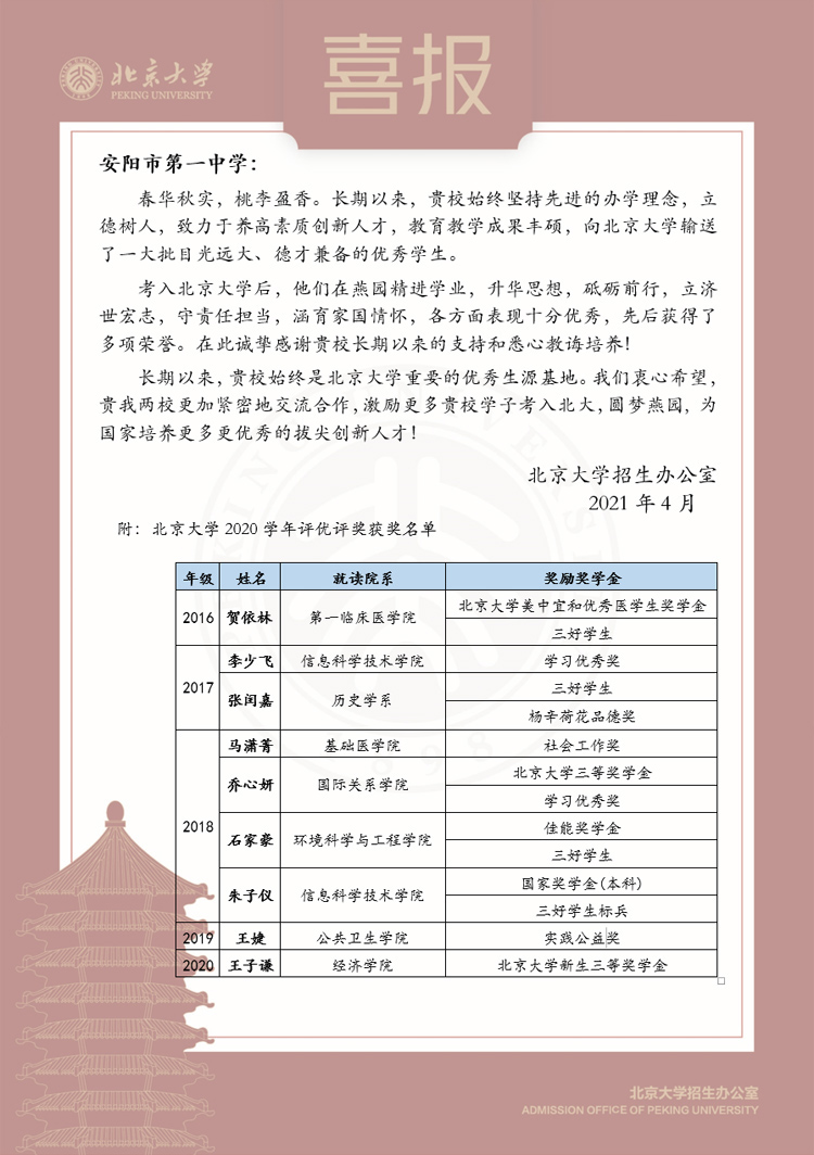 北京大學(xué)向我校發(fā)來喜報。在2020學(xué)年的北京大學(xué)評優(yōu)評獎中,我校畢業(yè)生賀依林、李少飛、張潤嘉、馬瀟菁、喬心妍、石家豪、朱子儀、王婕、王子謙等多位同學(xué)獲獎。 2013年以來,我校共有100名同學(xué)考入北大清華,一本上線率穩(wěn)定在92%以上。同學(xué)們進(jìn)入高校后,依然秉承安陽一中學(xué)生的優(yōu)良品質(zhì),精進(jìn)學(xué)業(yè),立濟(jì)世宏志,守責(zé)任擔(dān)當(dāng),涵育家國情懷,各方面表現(xiàn)突出。 我校將繼續(xù)深化教育改革,加強(qiáng)素質(zhì)教育,不斷提高辦學(xué)水平,為高校輸送更多的優(yōu)秀人才,努力辦好人民滿意的教育。 |