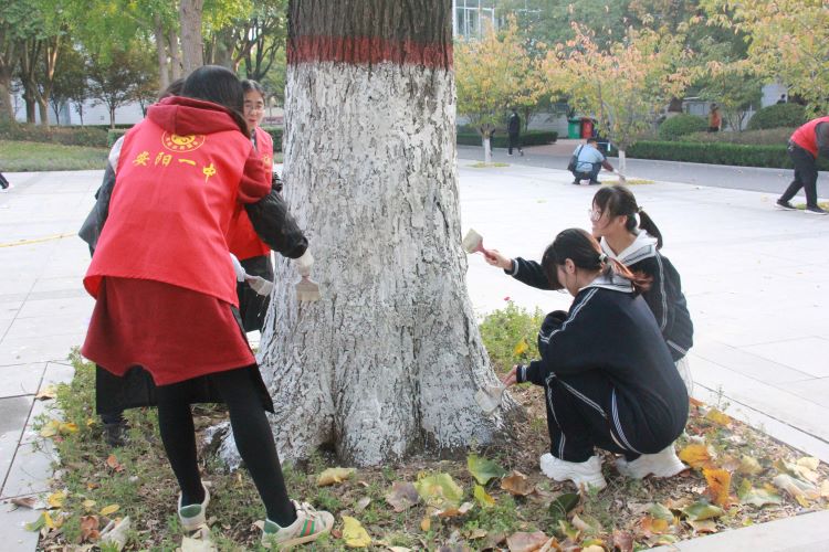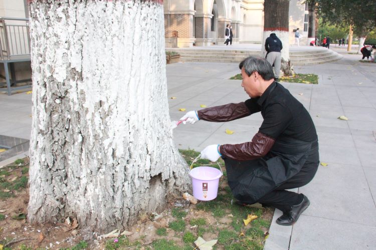 10月24日,我校開展建校勞動,為越冬樹木涂白樹干,保障樹木平安過冬。 總務(wù)處調(diào)制好樹干涂白劑,發(fā)放小桶、刷子、圍裙、手套、袖套等工具,并由綠化工作人員為大家進行樹干涂白技術(shù)指導(dǎo)。老師們按照規(guī)劃的區(qū)域,仔細(xì)刷涂,遠(yuǎn)遠(yuǎn)望去,棵棵樹木如同穿上了一雙雙長筒“白靴”。 為樹木刷上涂白劑,不僅可以殺菌、防蟲,還能保暖、防曬。吸收一定熱量,樹干就不會因晝夜溫差巨大而凍裂,從而有效保護校園內(nèi)樹木的健康生長。 建校初期,老一輩的安陽一中人在校園里親手栽下了海棠、槐樹、白楊……這些已成為校園里最美的風(fēng)景;如今,我校每年都開展建校勞動,安陽一中人依然通過各種方式共同呵護我們綠樹成蔭的美麗校園。 |