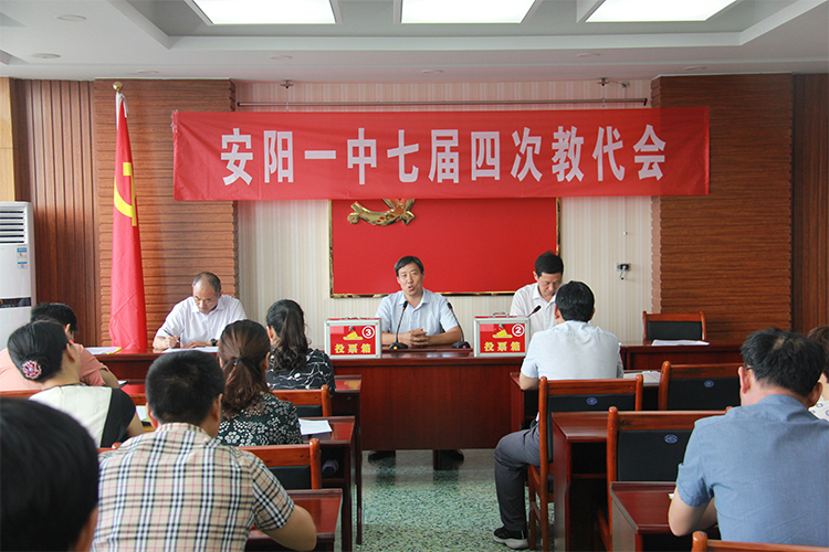 我校第七屆教職工代表大會第四次會議,7月12日下午在綜合樓613會議室隆重召開。本次會議的議題是:修改《安陽市第一中學(xué)獎勵性績效工資方案》和《安陽市第一中學(xué)教師中、高級專業(yè)技術(shù)職務(wù)任職資格推薦實(shí)施細(xì)則》(下文簡稱《方案》、《細(xì)則》)中的部分條款。會議由王國卿副校長主持,工會常務(wù)副主席、副校長陳朝陽致開幕詞,工會主席、副校長崔彥軍做了講話。會議應(yīng)到代表63人,因事、因病請假4人,實(shí)到59人,符合法定人數(shù)。 會議在莊嚴(yán)的國歌聲中開幕,陳朝陽副校長在致辭中,回顧了一年來,學(xué)校圍繞“師生友好•科學(xué)發(fā)展”開展的主要工作,指出教代會對發(fā)揮教職工的主人翁意識,促進(jìn)民主、科學(xué)管理,有著重要作用。辦公室主任吳燕對《方案》、《細(xì)則》中部分條款的擬修改意見進(jìn)行了說明和解釋。