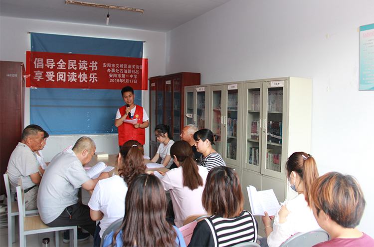 5月17日下午我校志愿者走進(jìn)石油路社區(qū),開展了“倡導(dǎo)全民讀書 享受閱讀快樂”的活動。 志愿者們?yōu)樯鐓^(qū)居民精心準(zhǔn)備了《全民閱讀活動讀本》。語文老師雷法凱為大家?guī)砹恕度绾伍喿x》講座,從娛樂型讀書、提升型讀書、實(shí)用型讀書三種不同的讀書角度向現(xiàn)場聽眾介紹了讀書的方法,并推薦了一些適合不同年齡段的讀者閱讀的書目和微信公眾號。講座結(jié)束后,雷老師與居民進(jìn)行了一對一交流,就如何選擇書目等問題進(jìn)行了討論。