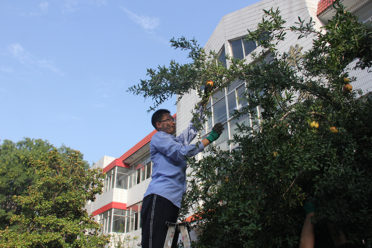 又是豐收的一年。教學(xué)樓前的石榴樹已被滿樹的碩果壓彎了腰,桂花的香氣彌漫了秋日的校園。 到了一年一度摘石榴的日子,9月25日清晨,值周班綠化組的同學(xué)們在老師的帶領(lǐng)下對(duì)校園內(nèi)的石榴進(jìn)行采摘。同學(xué)們分工合作,有的采摘低處的果實(shí),有的踩著梯子夠高處的,沒多久就把樹上的石榴全部采摘了下來。之后,學(xué)校總務(wù)處將石榴平均分到了每個(gè)班和老師的辦公室,讓師生一起品嘗這份甘甜。 我們似乎已經(jīng)習(xí)慣了果實(shí)掛滿枝頭的校園一景。石榴、杏兒、桃子……隨手可得的果實(shí)卻在一中的校園里被保護(hù)到成熟,雖屬平常小事,卻是全體師生文明素養(yǎng)的體現(xiàn)。‘’