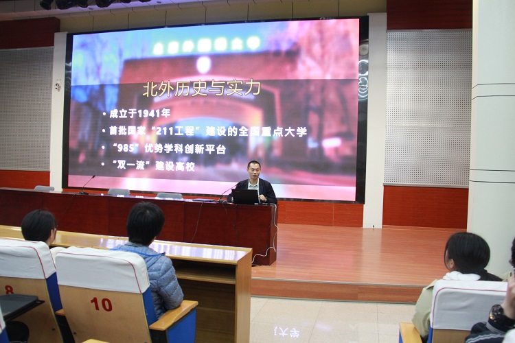 4月12日下午,北京外國語大學(xué)亞非學(xué)院韓語系主任、中國韓國(朝鮮)語教育研究學(xué)會(huì)常務(wù)理事汪波教授到我校講學(xué),在電教樓五樓報(bào)告廳,為師生開展北京外國語大學(xué)專業(yè)設(shè)置、招生就業(yè)等宣講活動(dòng)。 汪教授首先通過視頻短片,讓同學(xué)們了解了北京外國語大學(xué)的發(fā)展史,領(lǐng)略了北外優(yōu)美的校園環(huán)境和人文氛圍。隨后,汪教授對(duì)北外獨(dú)有的“一帶一路”特色招生方式進(jìn)行講解,詳細(xì)介紹了學(xué)校的學(xué)科設(shè)置、招生方式、以及就業(yè)前景等相關(guān)信息,引發(fā)同學(xué)們對(duì)北外的向往。 汪教授語言風(fēng)趣幽默,學(xué)生們反應(yīng)熱烈,現(xiàn)場掌聲陣陣。講座結(jié)束后,汪教授和學(xué)生們親切互動(dòng),解答了大家關(guān)于語言學(xué)習(xí)、學(xué)校招生、出國深造等方面的問題。 我校通過積極努力,盡可能為學(xué)生爭取更多的,與大學(xué)專家、教授接觸的機(jī)會(huì),利用高校師資,使學(xué)生具有更開闊的視野,更開放的、更現(xiàn)代化的態(tài)度,為成為適應(yīng)現(xiàn)代社會(huì)要求的人才積蓄力量。