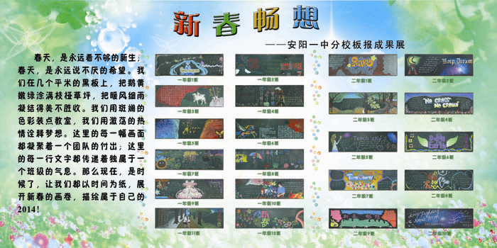 2014年2月,安陽(yáng)一中分校組織舉行了“新春暢想”黑板報(bào)展示活動(dòng)。在為期一周的準(zhǔn)備時(shí)間里,高一高二年級(jí)的同學(xué)們利用業(yè)余時(shí)間創(chuàng)作了積極向上又風(fēng)格各異的黑板報(bào)作品,豐富了校園生活,展現(xiàn)了班級(jí)特色和同學(xué)們的精神面貌。