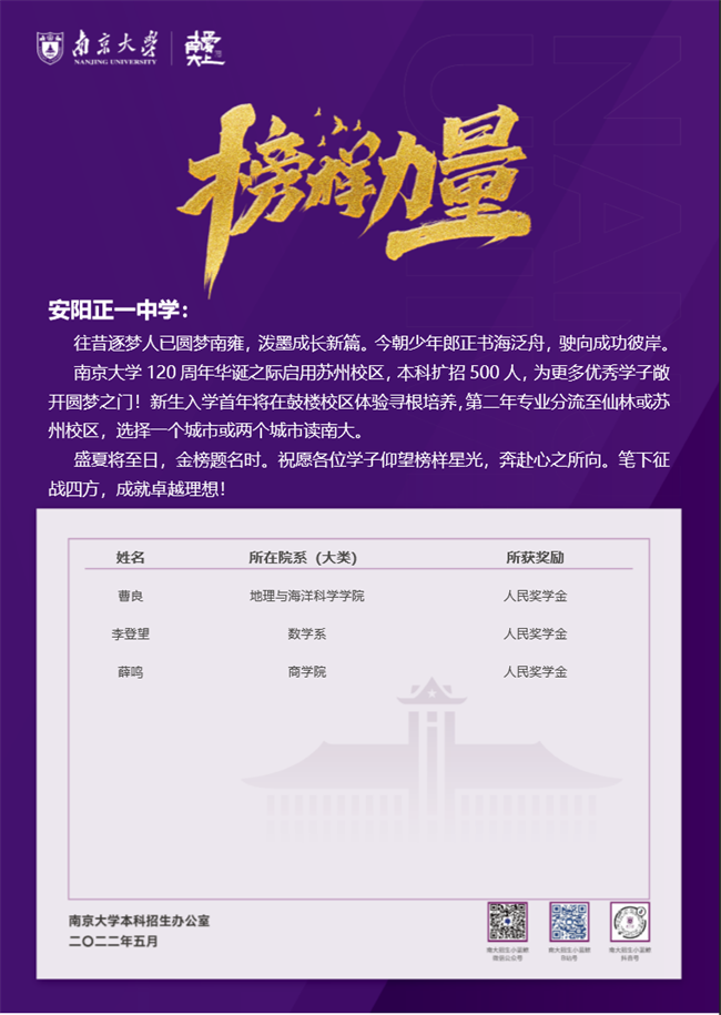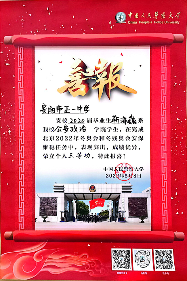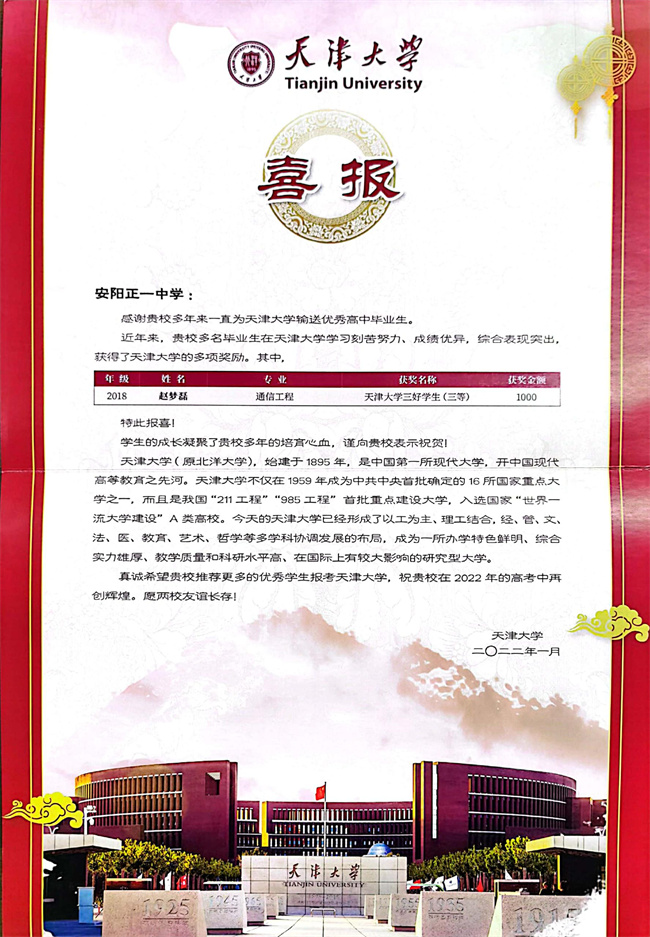近期,我校先后收到了來(lái)自華東理工大學(xué)、天津大學(xué)、南京大學(xué)和中國(guó)人民警察大學(xué)等多所國(guó)內(nèi)知名高校的喜報(bào)。在華東理工大學(xué)、南京大學(xué)和天津大學(xué)的評(píng)優(yōu)評(píng)獎(jiǎng)中,我校畢業(yè)生吳子涵、曹良、李登望、薛鳴、趙夢(mèng)磊獲得表彰,靳海巍在北京2022年冬奧會(huì)和冬殘奧會(huì)安保維穩(wěn)任務(wù)中榮立三等功。 安陽(yáng)正一中學(xué)是河南省優(yōu)秀民辦學(xué)校、河南省中小學(xué)心理健康示范校。建校以來(lái),正一中學(xué)依托安陽(yáng)一中成熟的管理模式,秉承安陽(yáng)一中的優(yōu)良校風(fēng),堅(jiān)持“以人為本,全面育人”的辦學(xué)宗旨,以“校風(fēng)正、管理嚴(yán)、質(zhì)量高”著稱(chēng),形成了積極健康向上的學(xué)校文化。 正一畢業(yè)生不忘“崇尚科學(xué)、志存高遠(yuǎn)、不尚浮華”的學(xué)風(fēng)和“團(tuán)結(jié)、求實(shí)、勤奮、進(jìn)取”的校風(fēng),勤奮耕耘、卓然成長(zhǎng),在祖國(guó)大地上書(shū)寫(xiě)自己的奮斗故事,為母校再添榮光。 我校將繼續(xù)堅(jiān)持“依法治校,規(guī)范辦學(xué)”的指導(dǎo)思想,全面落實(shí)黨的十九大精神和習(xí)近平總書(shū)記視察河南時(shí)的重要講話(huà)精神,明確辦學(xué)目標(biāo),堅(jiān)持辦學(xué)方向,砥礪前行,努力辦人民滿(mǎn)意的教育。 |